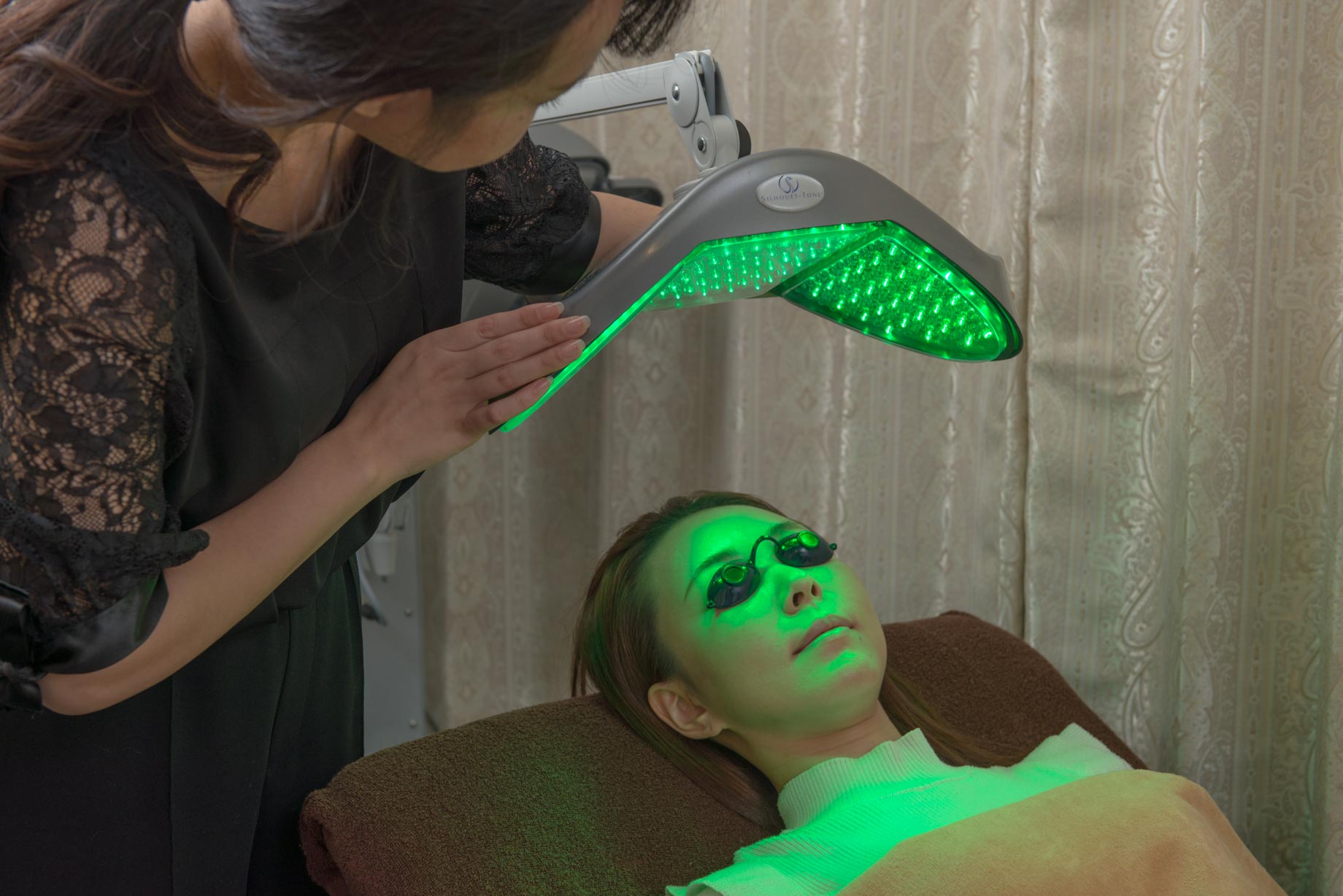 LEDの光はレーザーに比べて数十分の一の強さで、熱や痛みがないのが特徴です。肌質改善LEDは一般のLEDの約100倍の輝度があります。『ソーマライト』照射は安全性の高いLEDを肌にあてて肌質を改善、細胞を活性化させる「光ケア」の美容施術です。